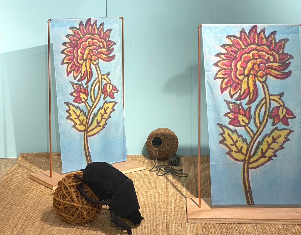 « Le rêve du bousier » c’est le titre du livre d’artiste sur lequel je viens de travailler en Inde cet été et qui mélange block print et broderie.